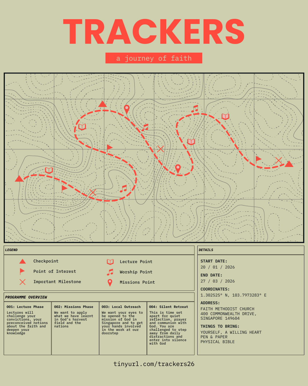Spaces are limited. For youth who are available and interested, please email trackersjourney@gmail.com for more information or register at https://tinyurl.com/trackers26. CLOSING DATE – 31 Dec 2025 (Wed)